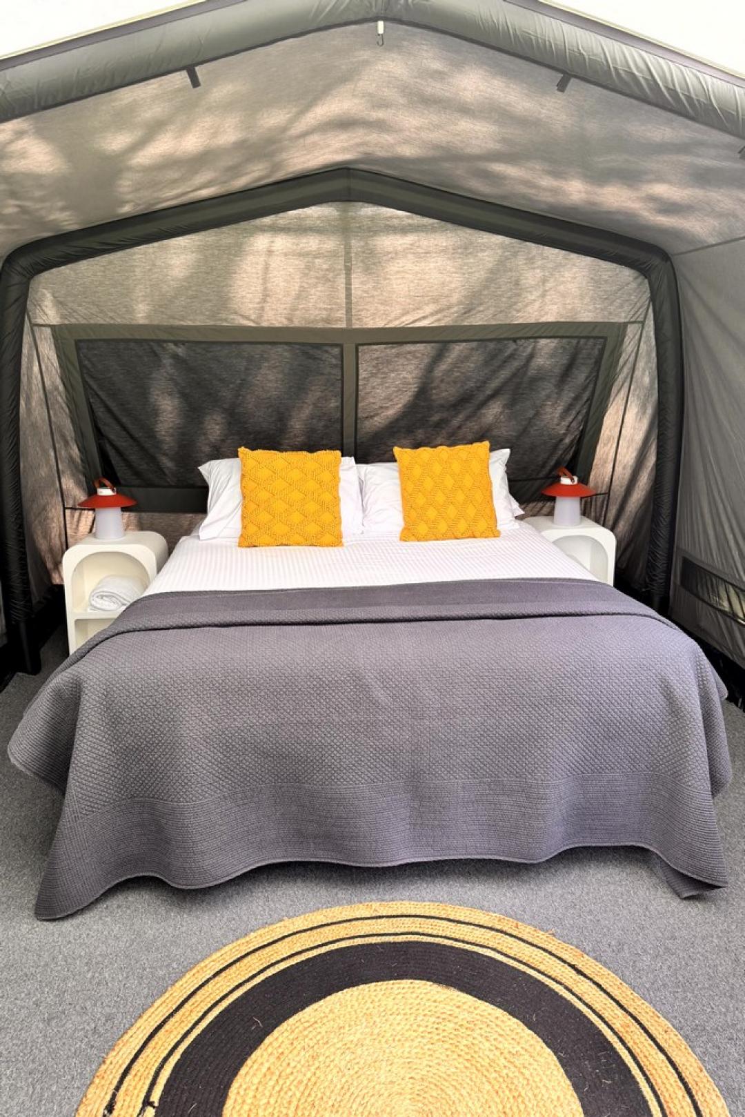 Enjoy a comfortable stay in our two-person camping tents, featuring a queen-size innerspring bed, bedside tables, camp lighting, and power for charging devices. The tent is also equipped with an electric heater and fan for comfort. Bedding, linens, and towels are provided, along with two camp chairs and a fire pot. Shared amenities, including toilets and a camp kitchen, are available within the caravan park.
